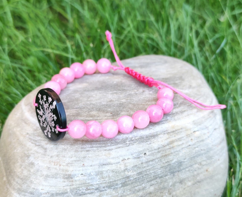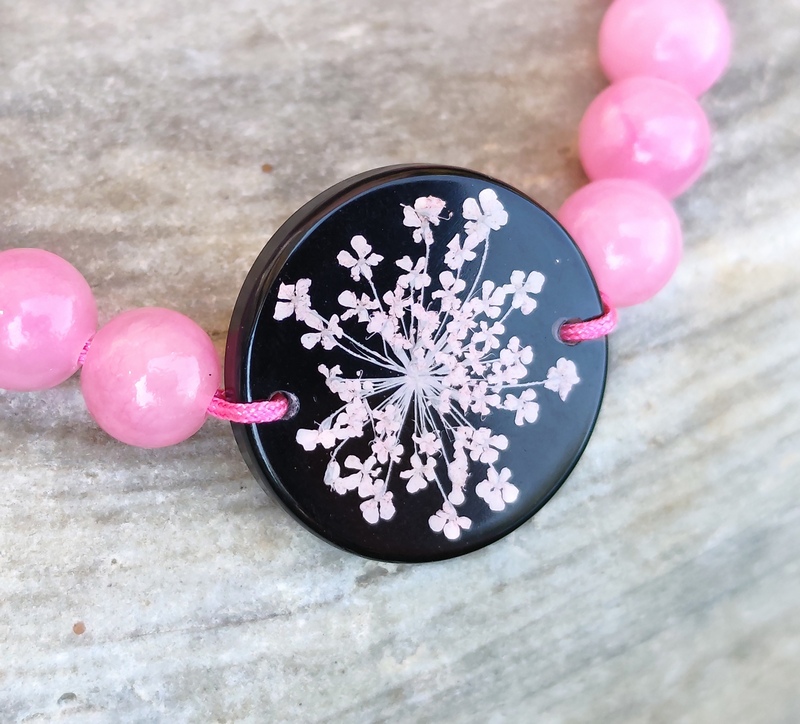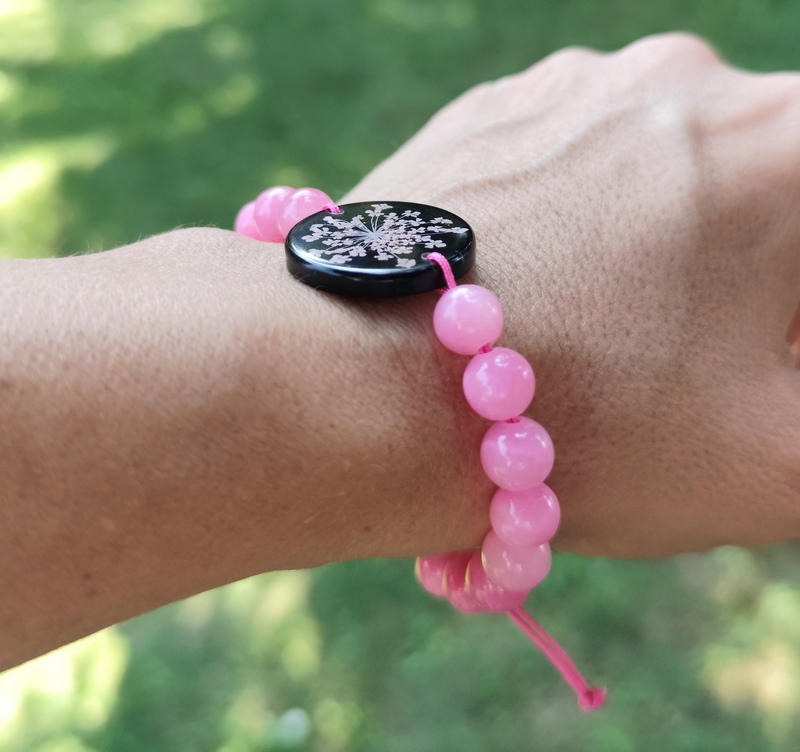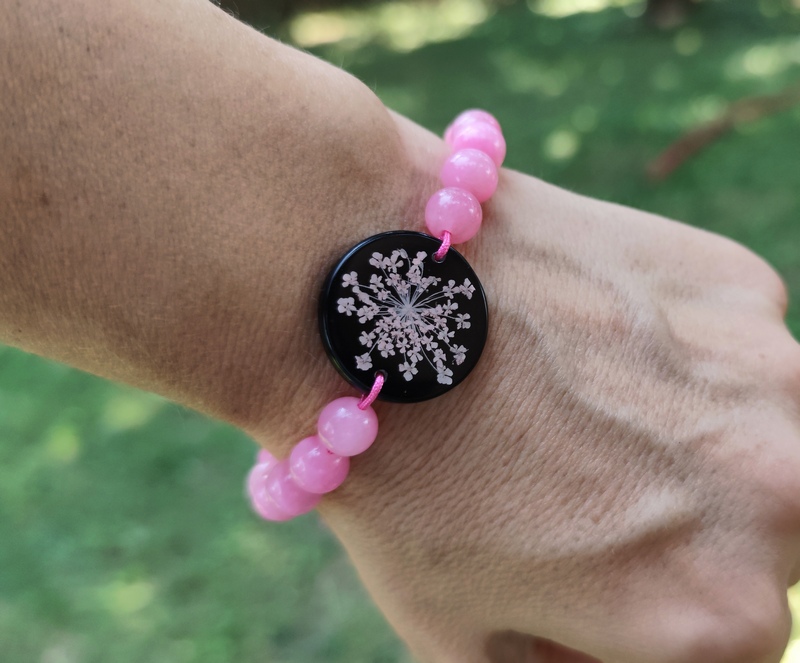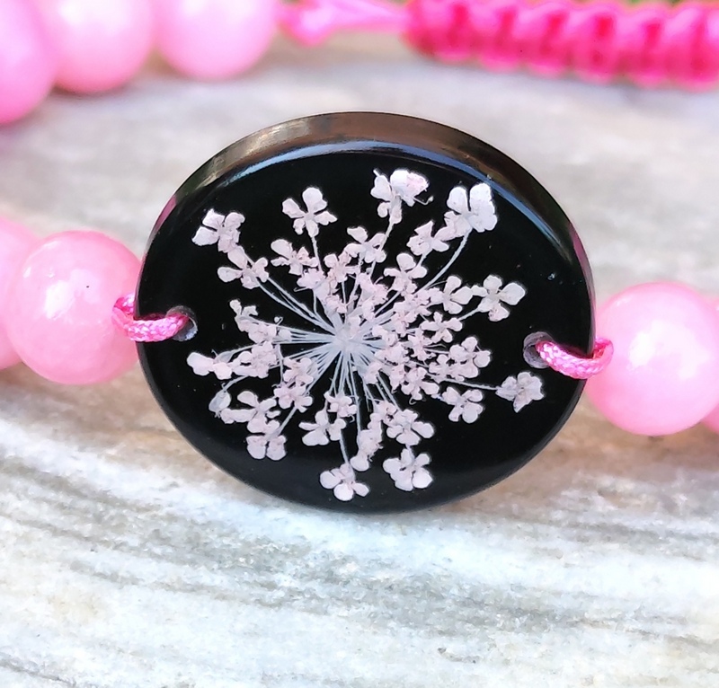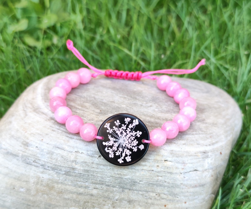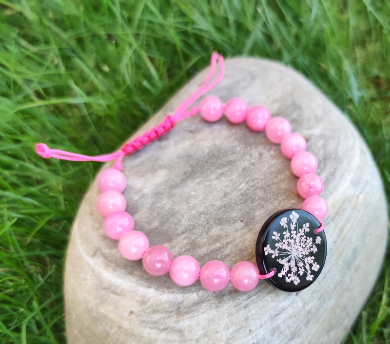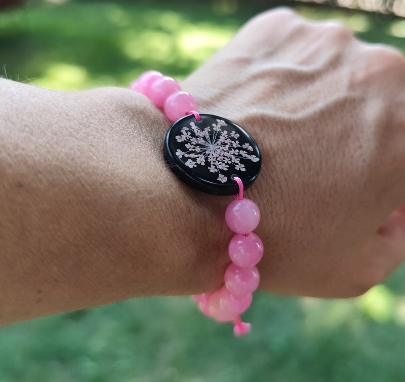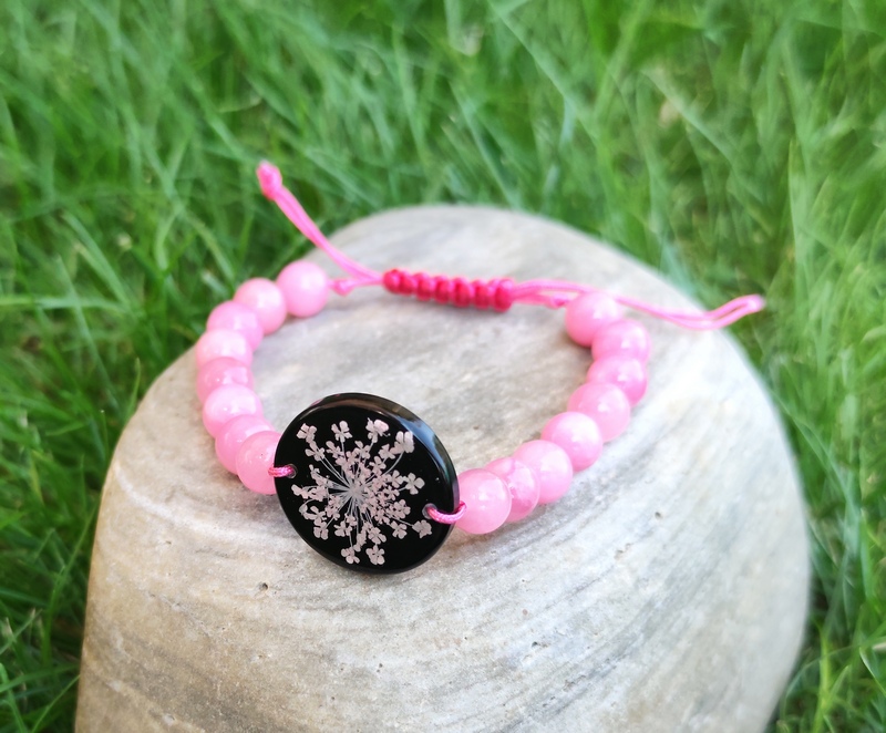 Romantický náramok vyrobený z centrálneho kabošonu zo živice, do ktorej som zaliala kvet Mrkvy divej. Jej drobné kvietky jemne prifarbené na ružovo pripomínajú krajku a krásne vyniknú na čiernom pozadí. Celý náramok je doladený ružovými minerálnymi korálkami jadeitu a nylonovou šnúrkou v podobnom odtieni.