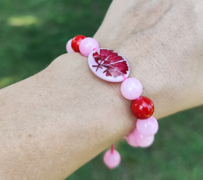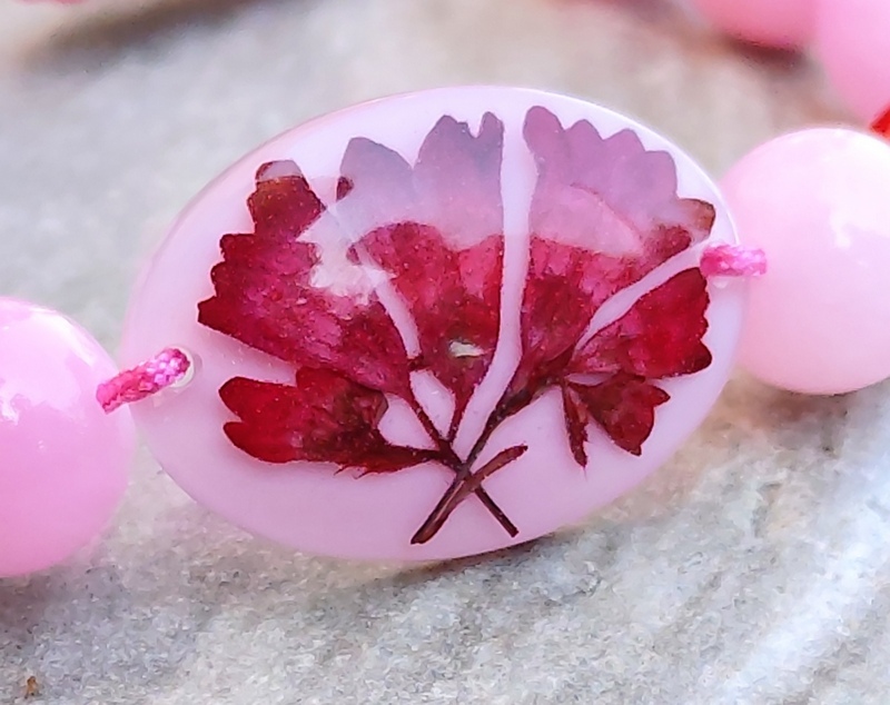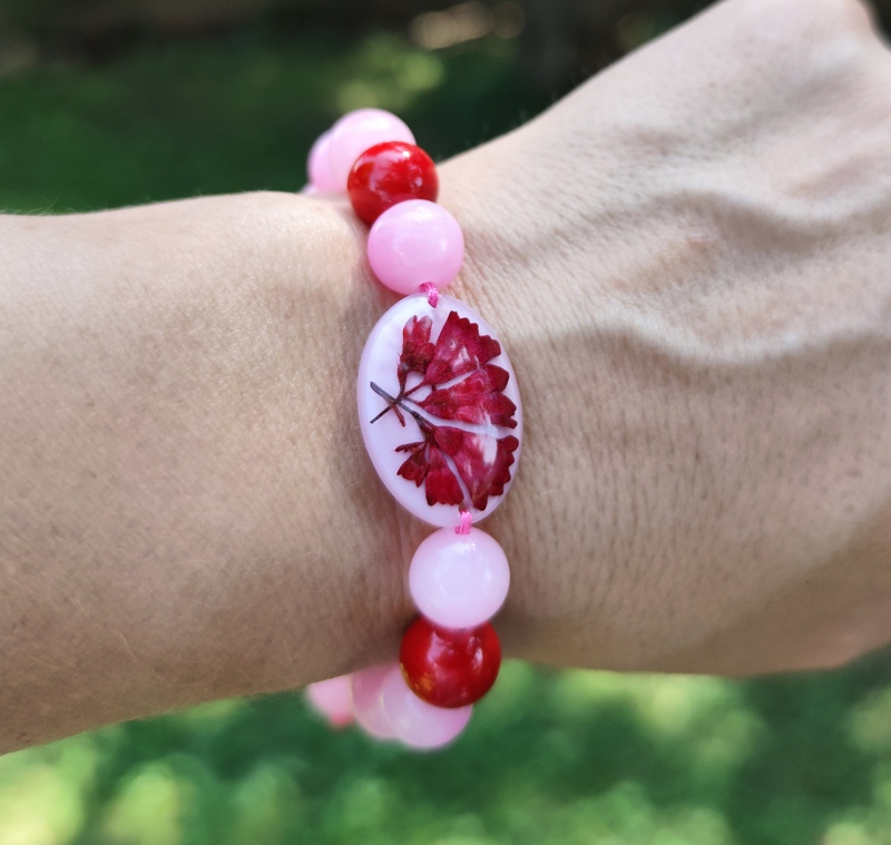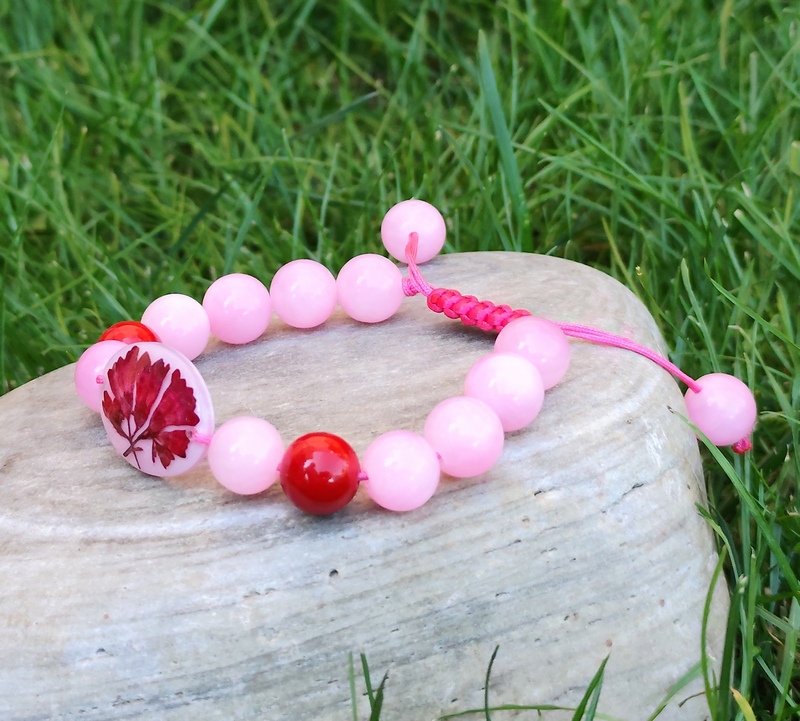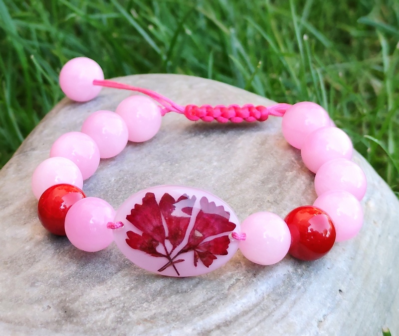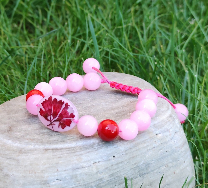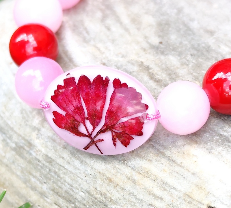 Romantický náramok vyrobený z centrálneho kabošonu zo živice, do ktorej som zaliala kvietky Heuchery. Jej červená farba krásne vynikne na ružovom pozadí, ktoré je doladené minerálnymi korálkami jadeitu v rovnakých farbách a ružovou nylonovou šnúrkou.
