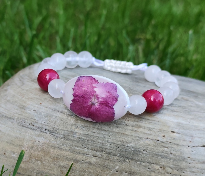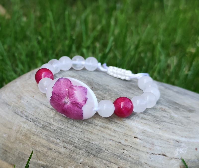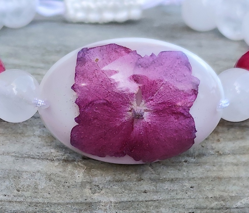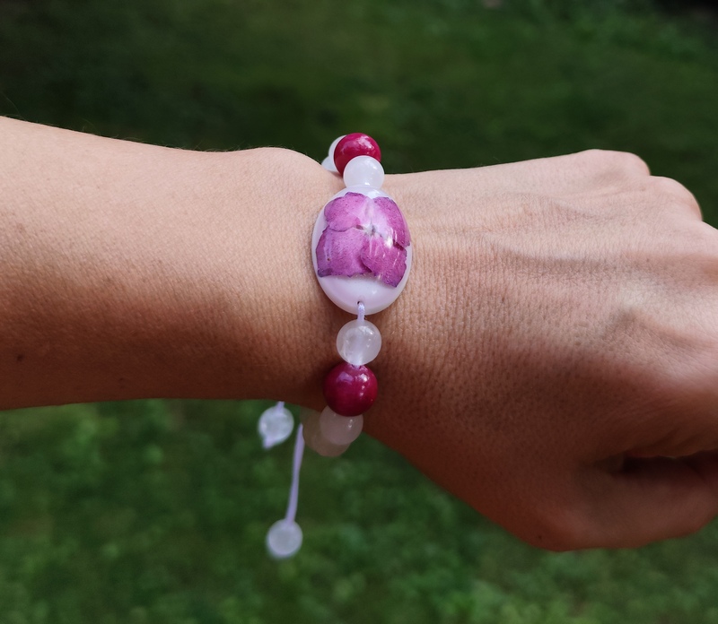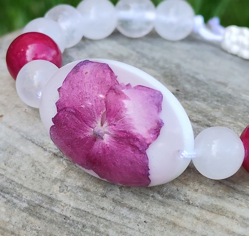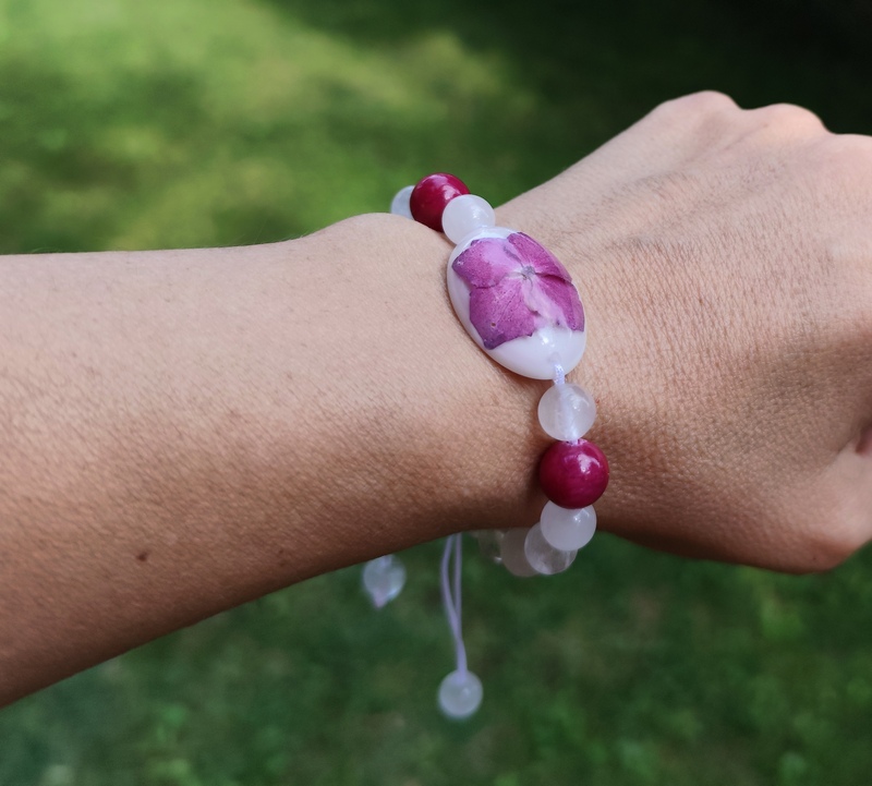 Romantický náramok vyrobený z centrálneho kabošonu zo živice, do ktorej som zaliala kvet Hortenzie. Jej tmavo ružová farba po okrajoch prechádzajúca do fialova, krásne vynikne na bielom pozadí, ktoré je doladené minerálnymi korálkami krištáľu a jadeitu v podobnom odtieni a bielou nylonovou šnúrkou.