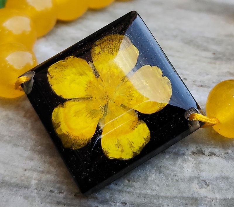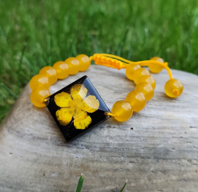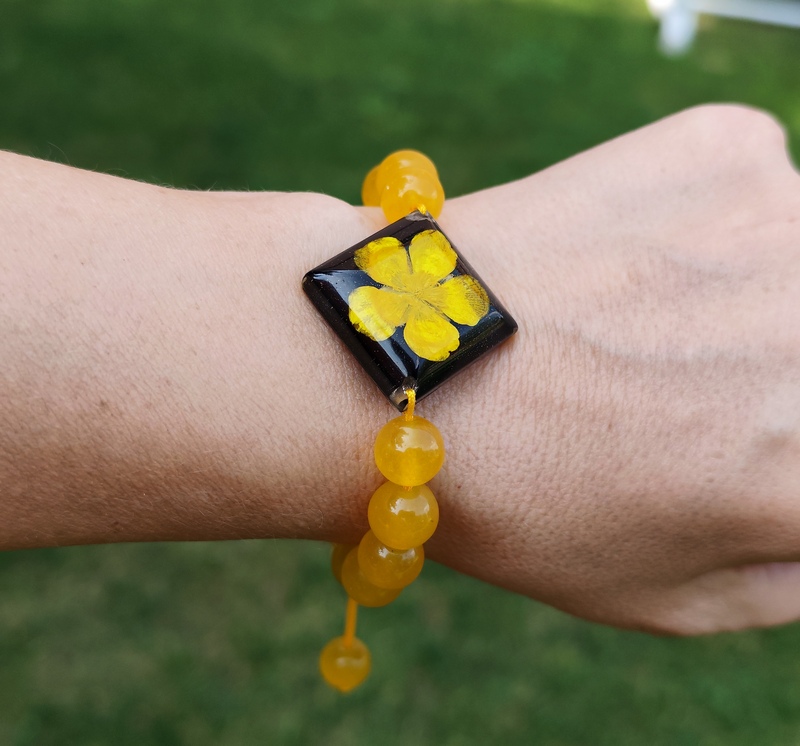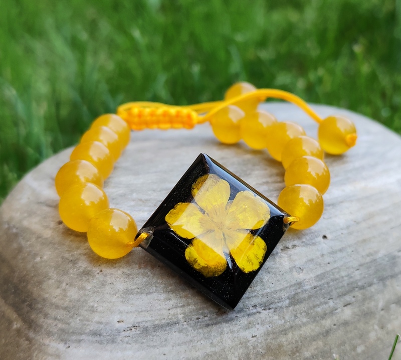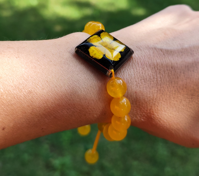 Zaujímavý náramok vyrobený z centrálneho kabošonu zo živice, do ktorej som zaliala kvet Iskerníka. Jeho žiarivá žltá farba krásne vynikne na čiernom pozadí, ktoré je doladené minerálnymi korálkami jadeitu v podobnom odtieni a žltou nylonovou šnúrkou. Tento náramok tak určite rozžiari vašu ruku.