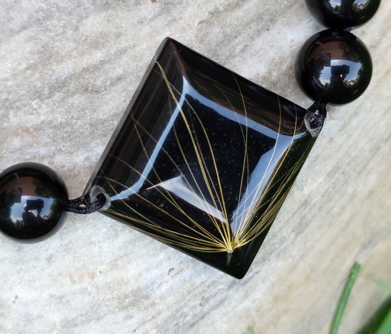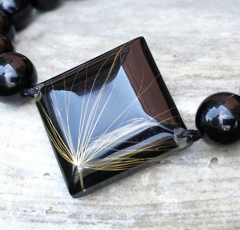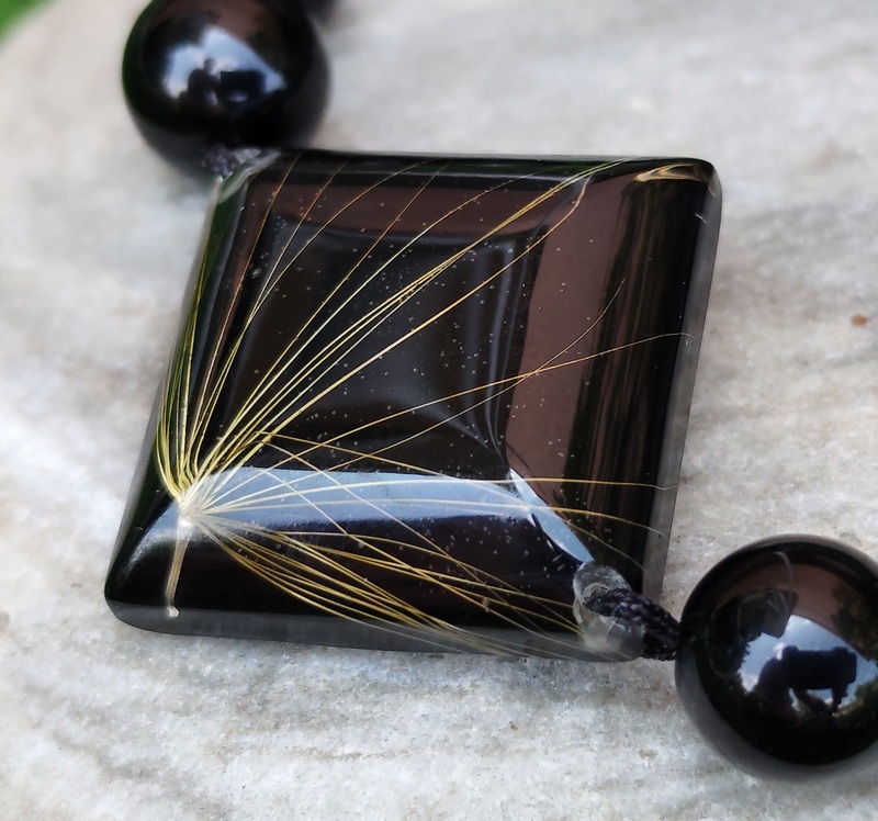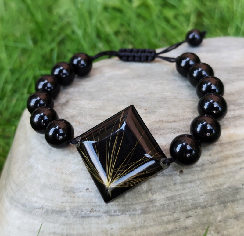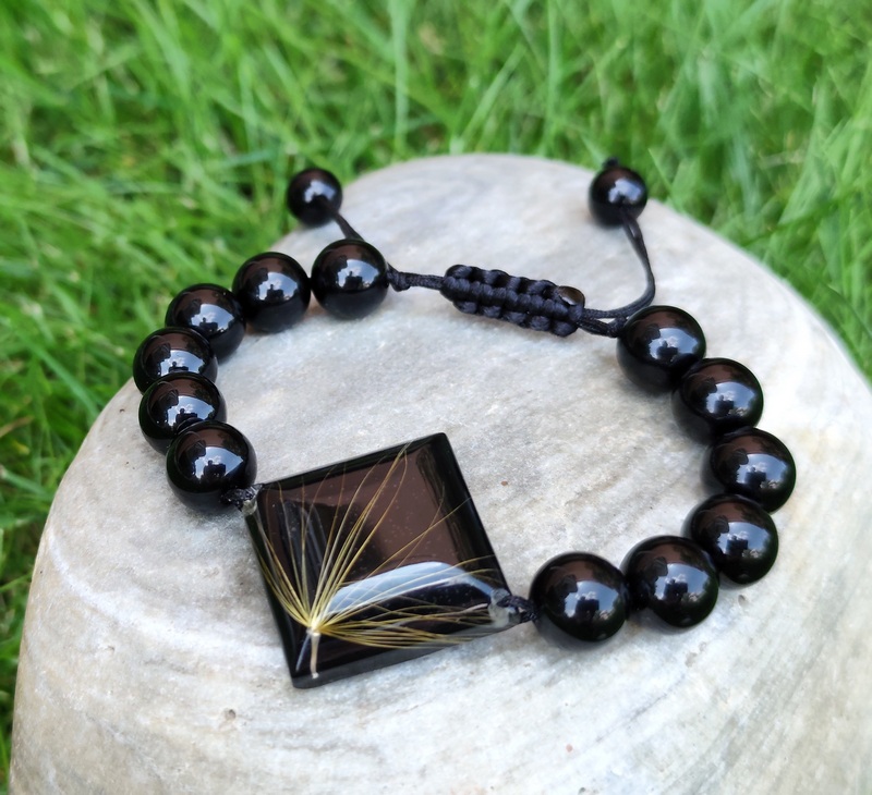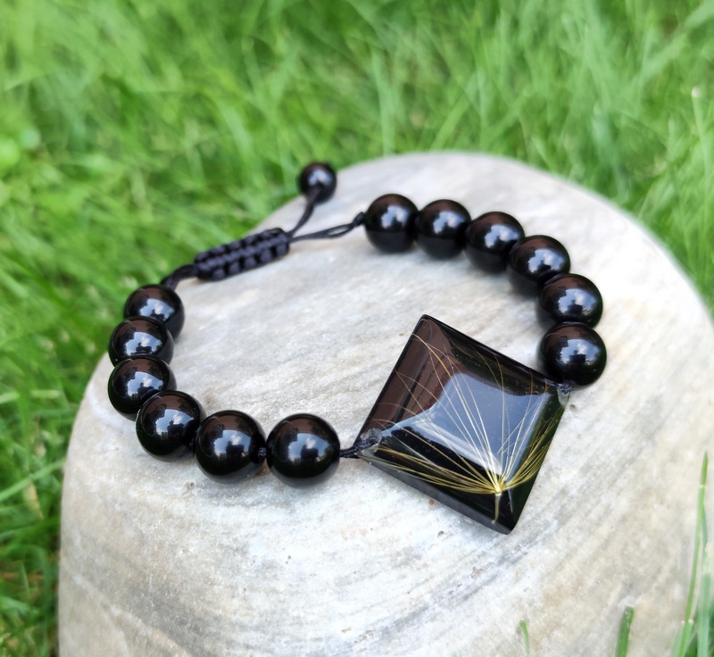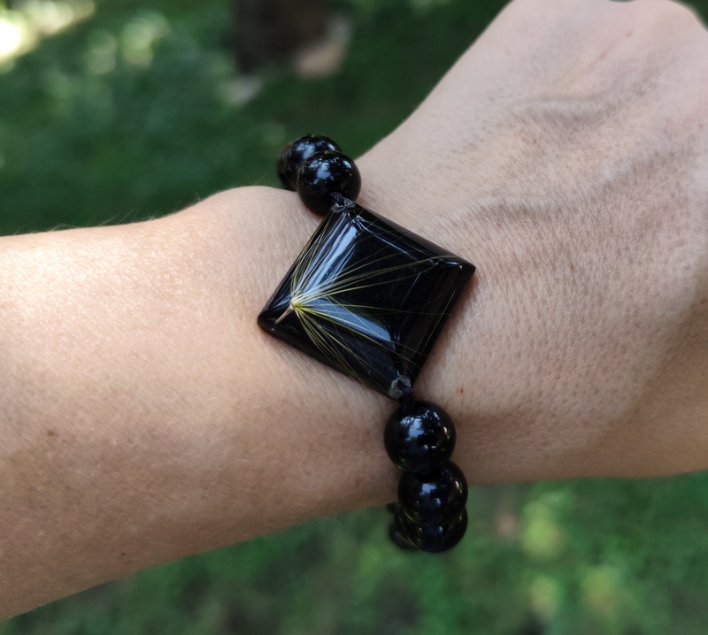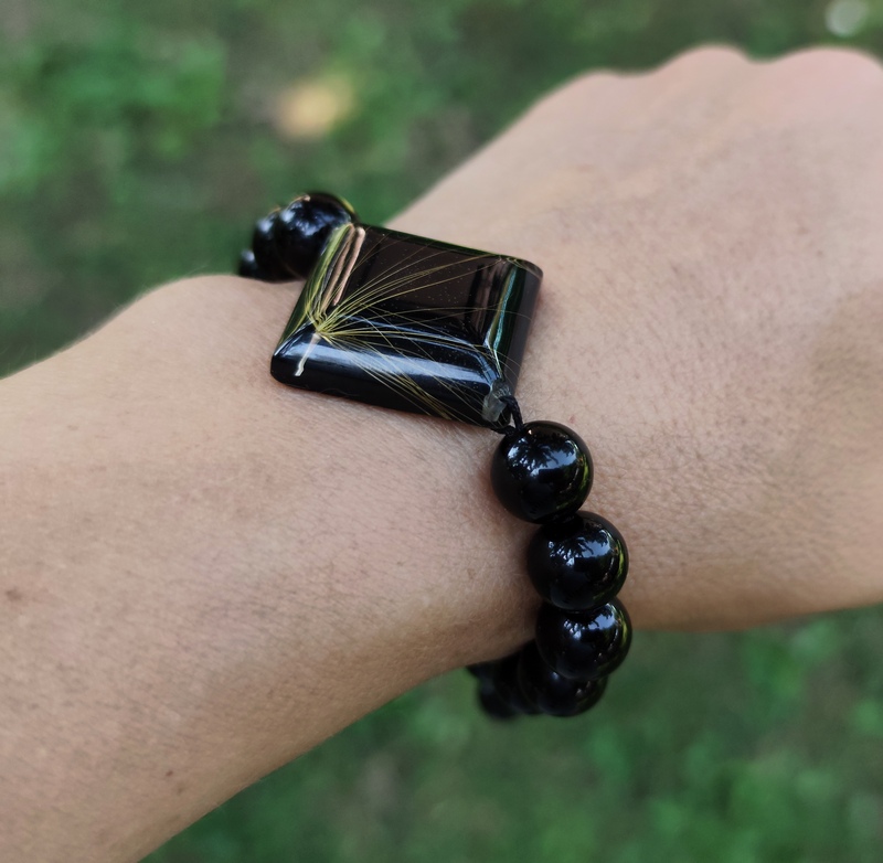 Zaujímavý náramok vyrobený z centrálneho kabošonu zo živice, do ktorej som zaliala zlatistý semienkový padáčik z veľkej páperovej hlavy liečivej rastlinky Kozobrady lúčnej. Jeho krása vyniká na čiernom pozadí, ktoré je doladené minerálnymi korálkami ónyxu a čiernou nylonovou šnúrkou. Náramok tak pôsobí veľmi elegantne.