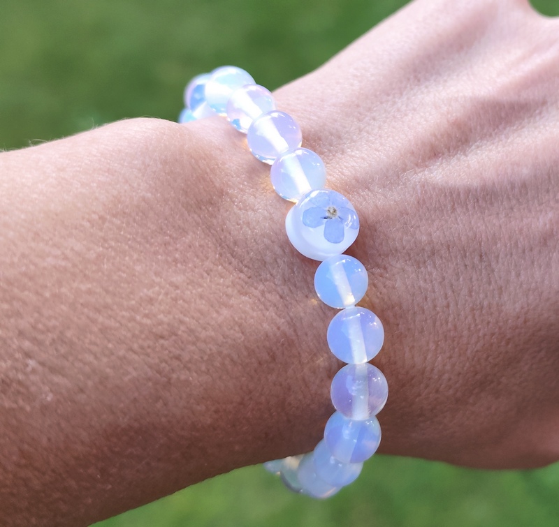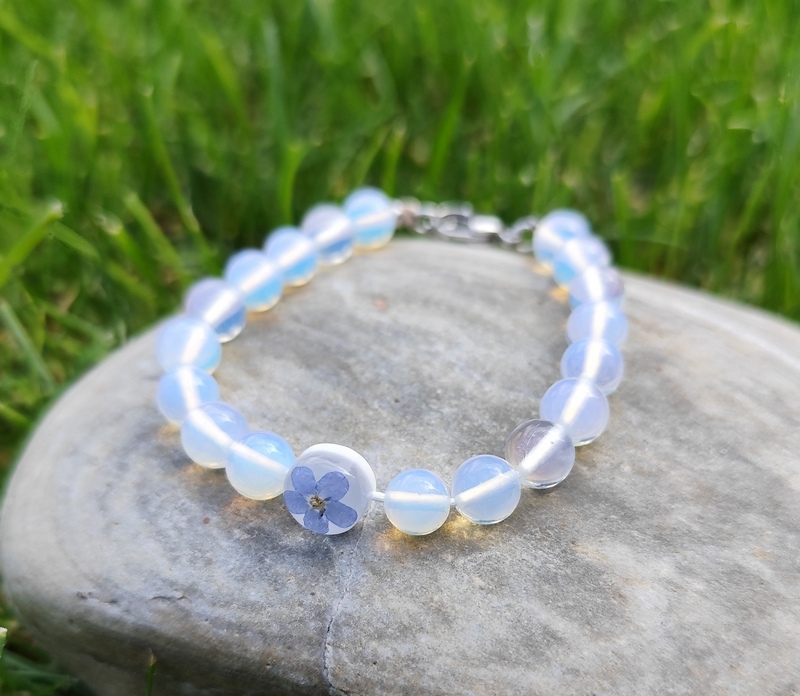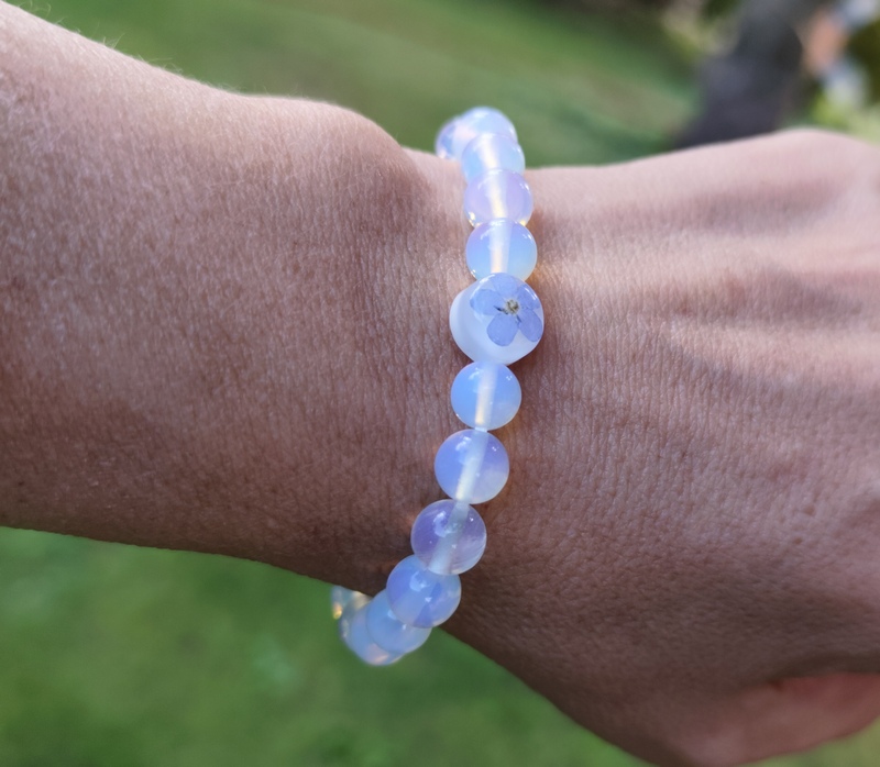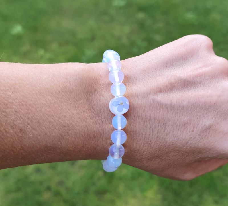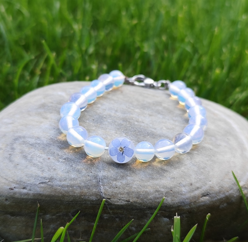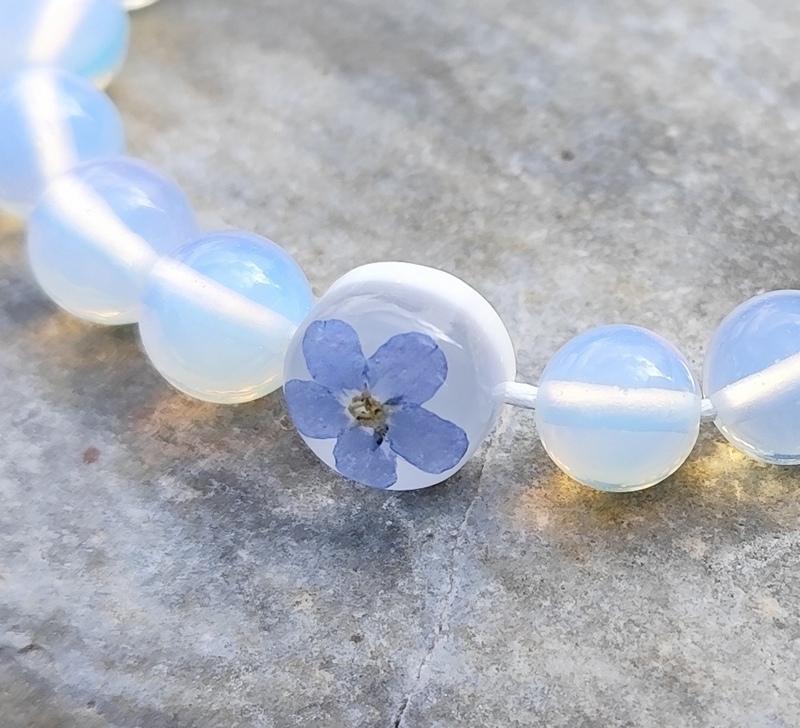 Jemný náramok vyrobený z centrálneho mini kabošonu zo živice, do ktorej som zaliala kvietok Nezábudky. Jej jemný kvietok krásne vynikne na bielom pozadí a spolu s korálkami opalitu navlečenými na bielej nylonovej šnúrke rozžiari vašu ruku.