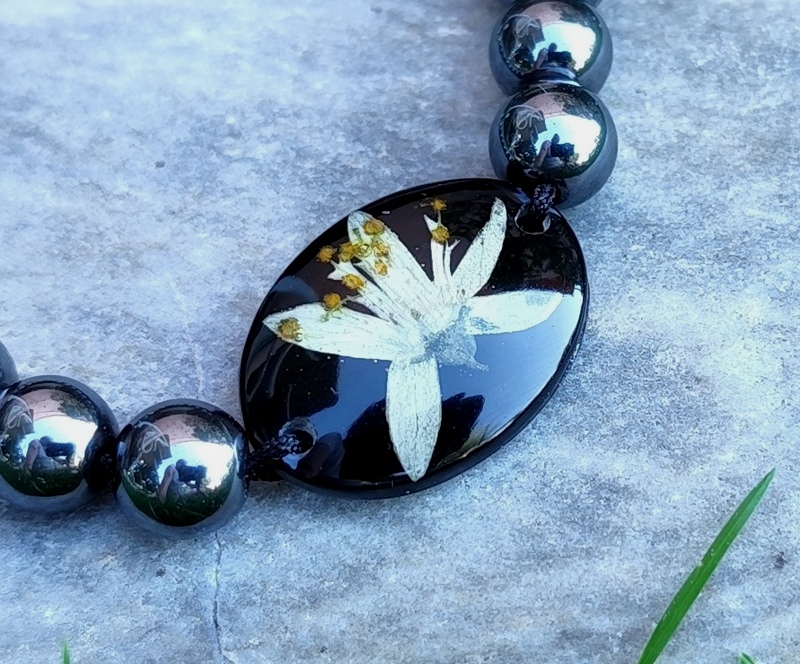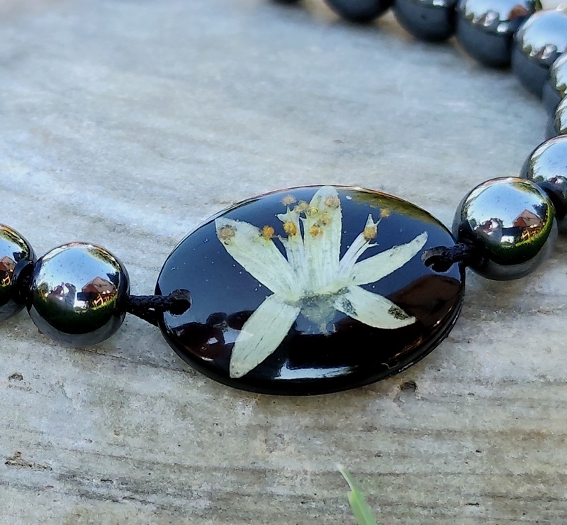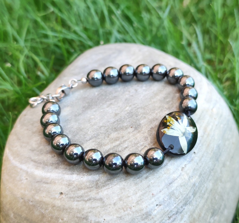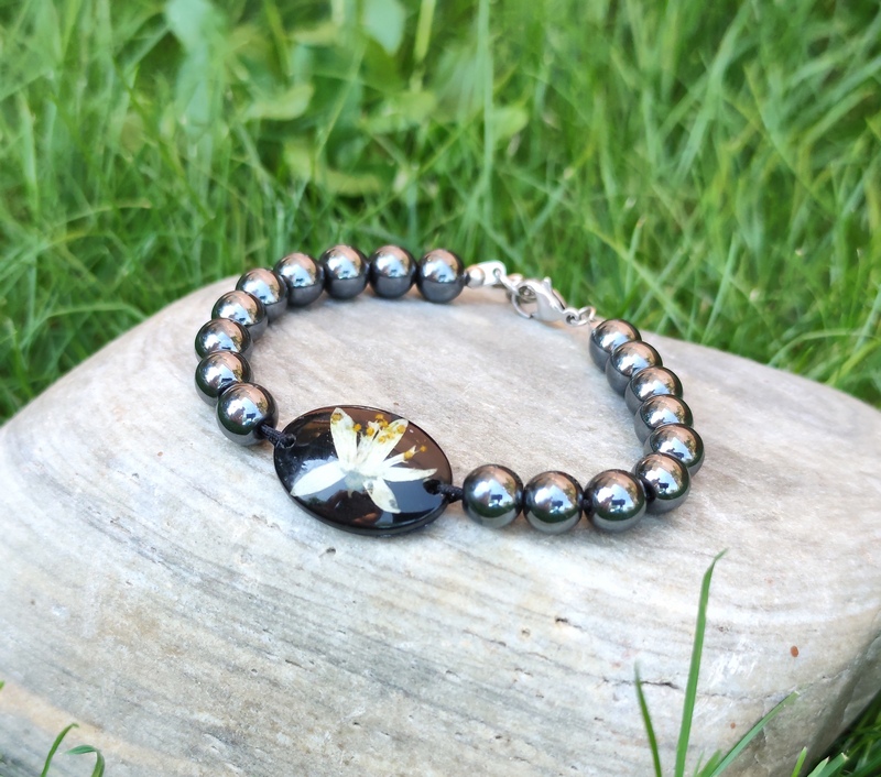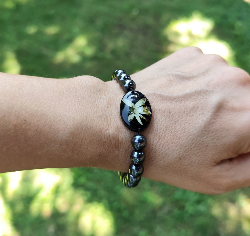 Elegantný náramok vyrobený z centrálneho kabošonu zo živice, do ktorej som zaliala kvietok z okrasného kríka Trojpuk nežný. Presne tak pôsobí aj jeho kvietok - jemne a nežne a krásne vynikne na čiernom pozadí, ktoré je doladené minerálnymi korálkami hematitu a čiernou nylonovou šnúrkou. Doplnený je kovovými korálkami z nerezovej ocele 304, ktoré nezmenia farbu a sú vhodné aj pre alergikov.